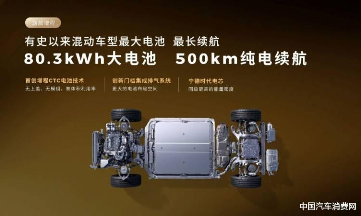 从动力系统来看,新车提供增程和纯电的选择,增程版基于800V平台打造,采用双电机四驱,综合功率400千瓦,使用全球混动车中最大的80.3度电池包+40L小油箱+800V快充组合,首创增程CTC技术,这让它CLTC纯电续航超过500公里,仅需一刻钟,就能将电量从何实现30%-80%的补能,确实足够夸张。